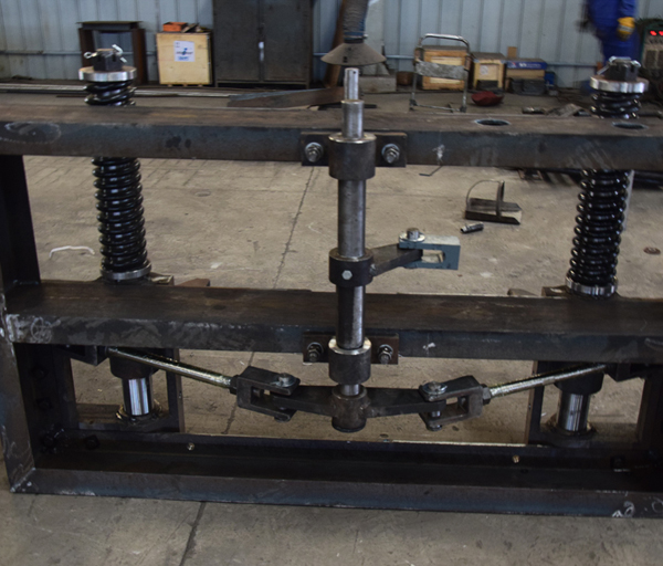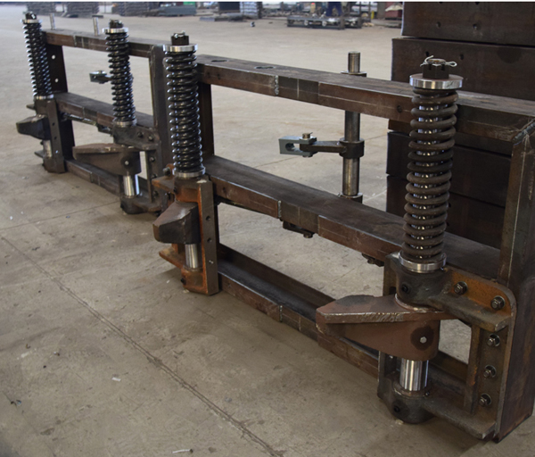 本阻車器的阻爪為軌道的一部分,阻爪抬起時(shí)阻住礦車車輪,實(shí)現(xiàn)對礦車的定位。落下時(shí)與軌道高度一致,便于各種礦車通行;軌道中間無機(jī)構(gòu),便于安裝其它設(shè)備。